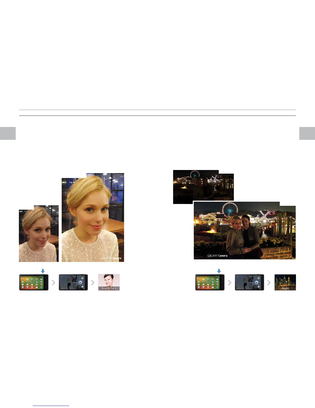 Turn on the camera function Press the Smart button Select Night modeTurn on the camera function Press the Smart button Select Beauty Face mode