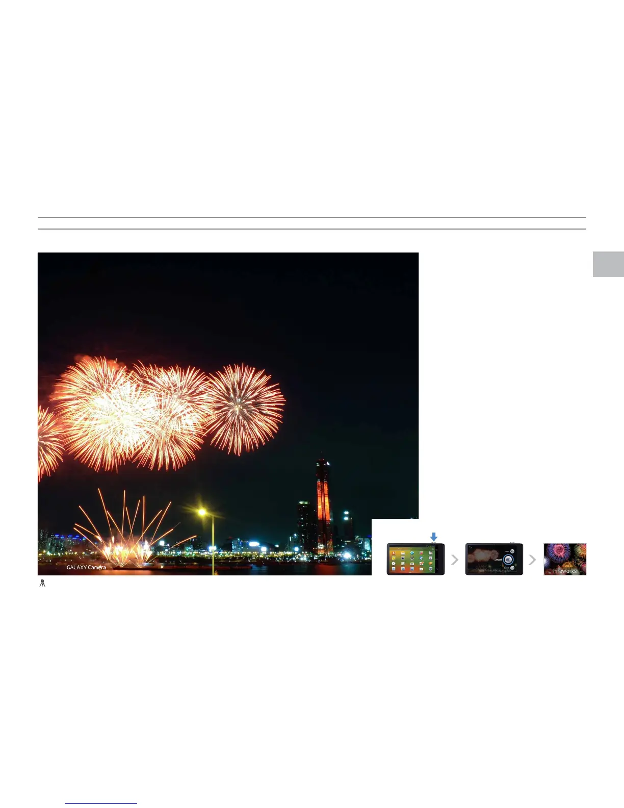 Turn on the camera function Press the Smart button Select Fireworks mode