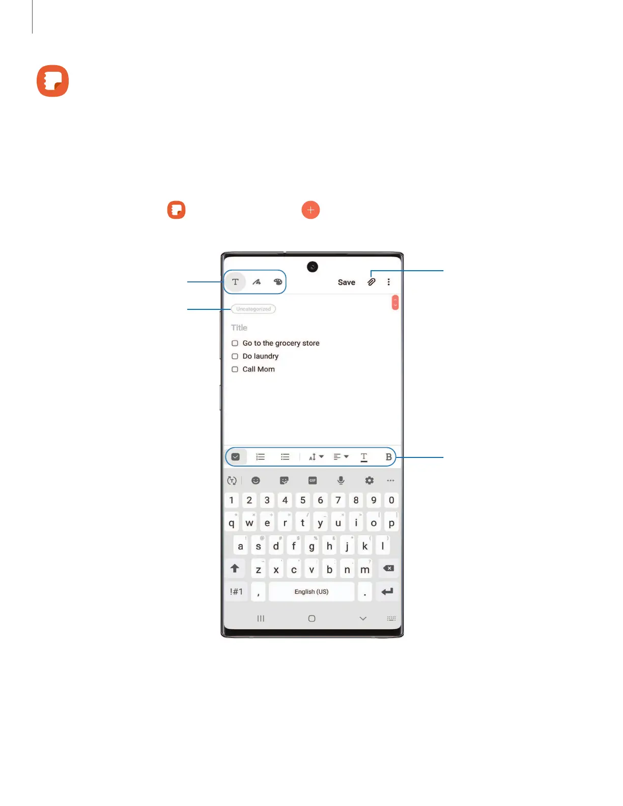 Use Samsung Notes to create notes containing text, images with footnotes, voice