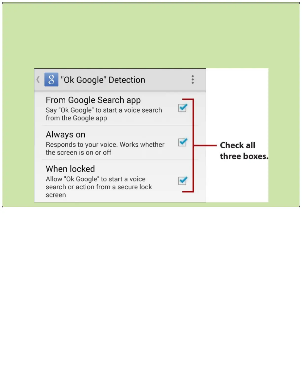 surethatallthreecheckboxesarechecked.Youmustsay“OKGoogle”fourtimessothatyour