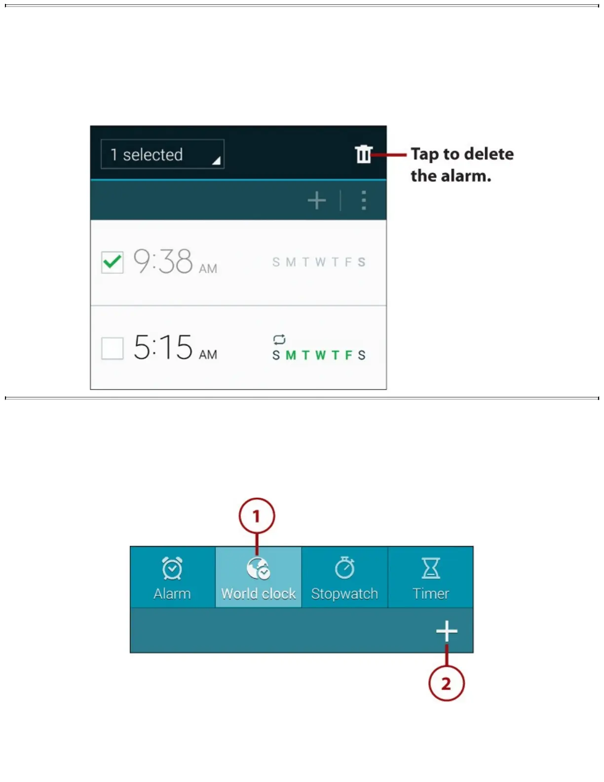 Todeleteanalarm,tapandholdthealarmuntiltheselectioncontrolsappear.Clockautomatically