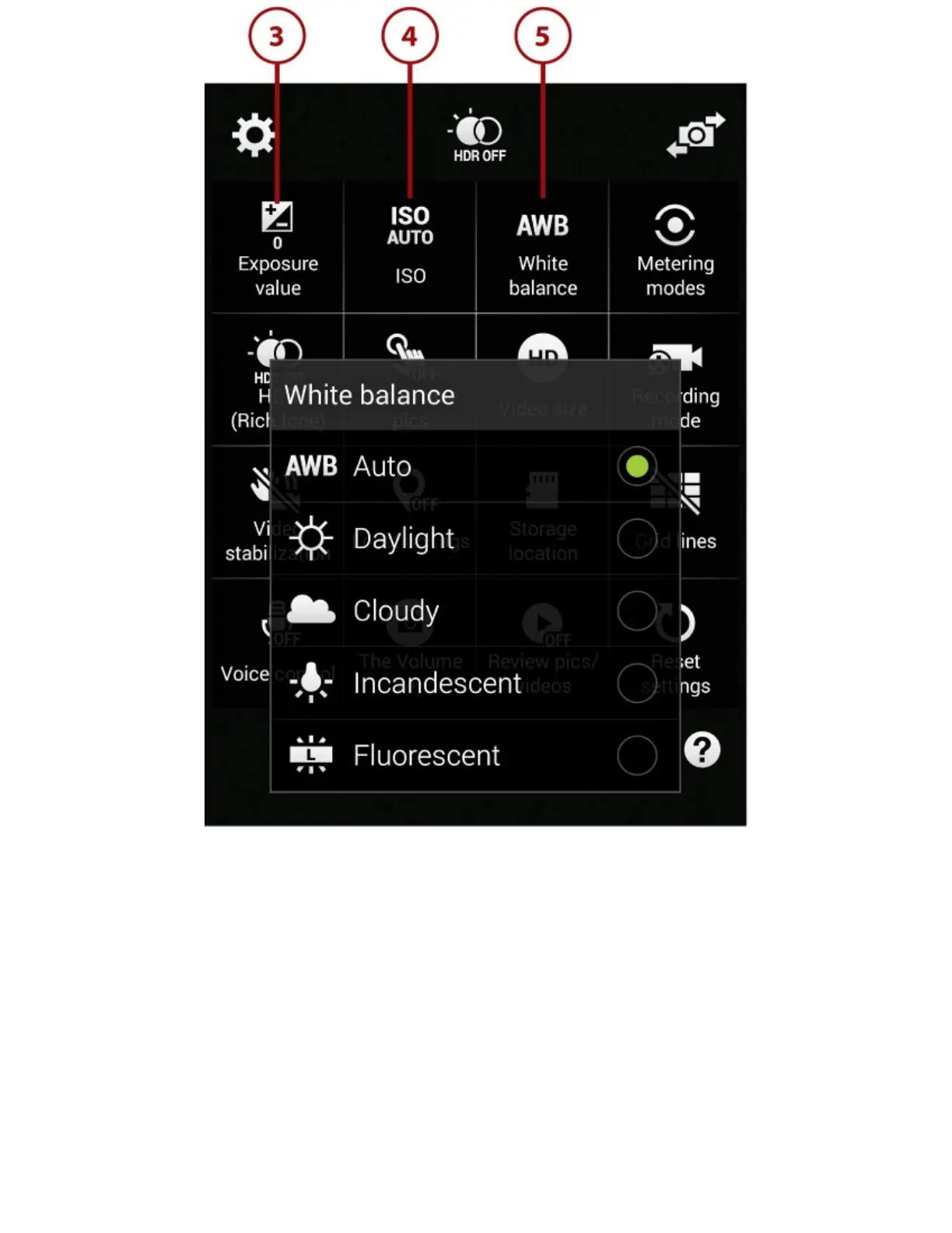 6.Taptheradiobuttonforthelightingconditionsyou’reusing:Daylight,Cloudy,Incandescent,or