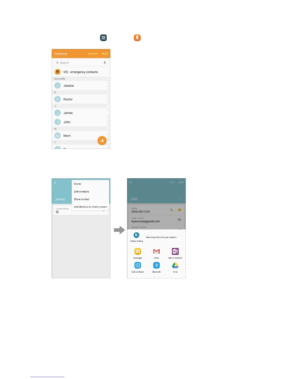 2. Tap a contact to display it, and then tap More > Share contact.