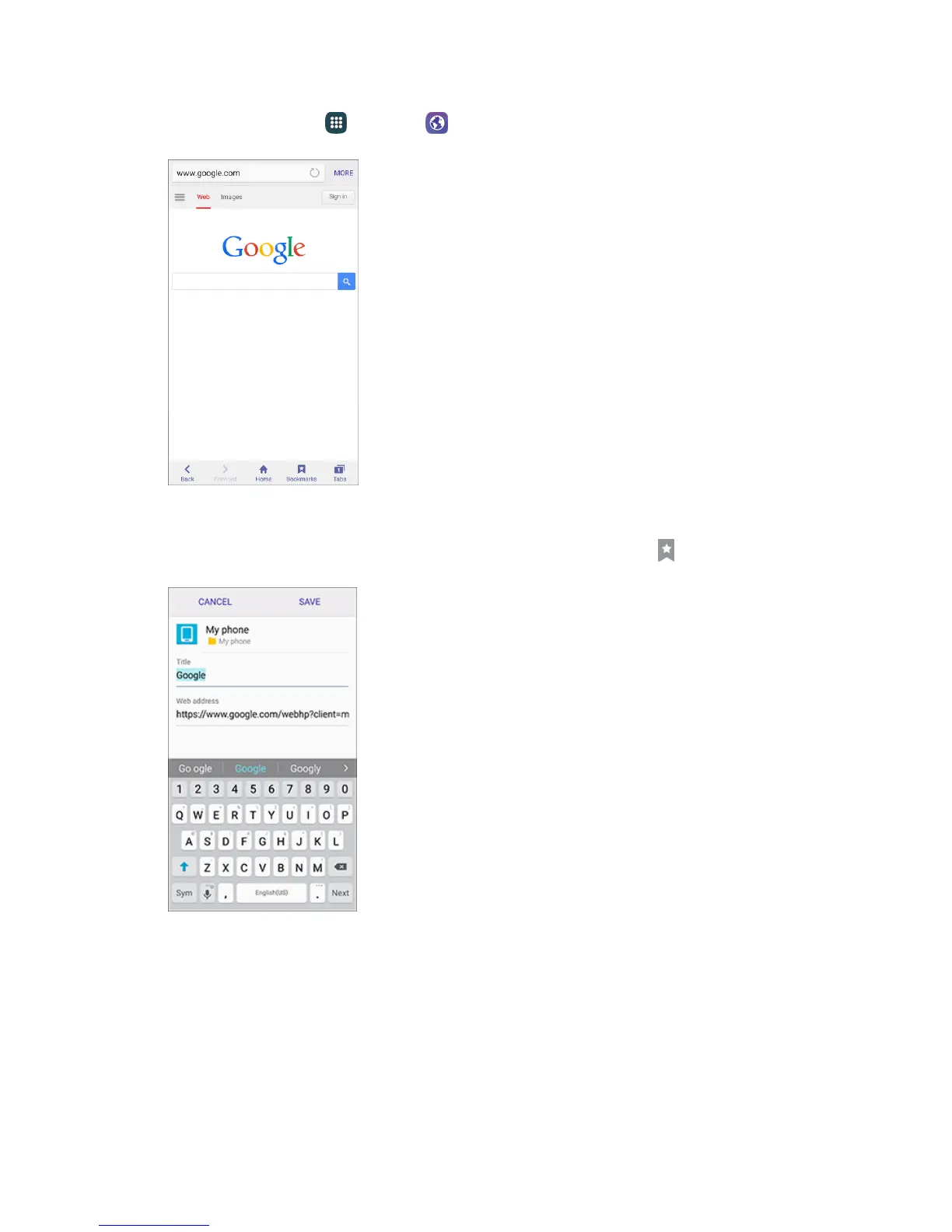 2. Navigate to the Web page you want to bookmark, and tap Bookmarks > Add.