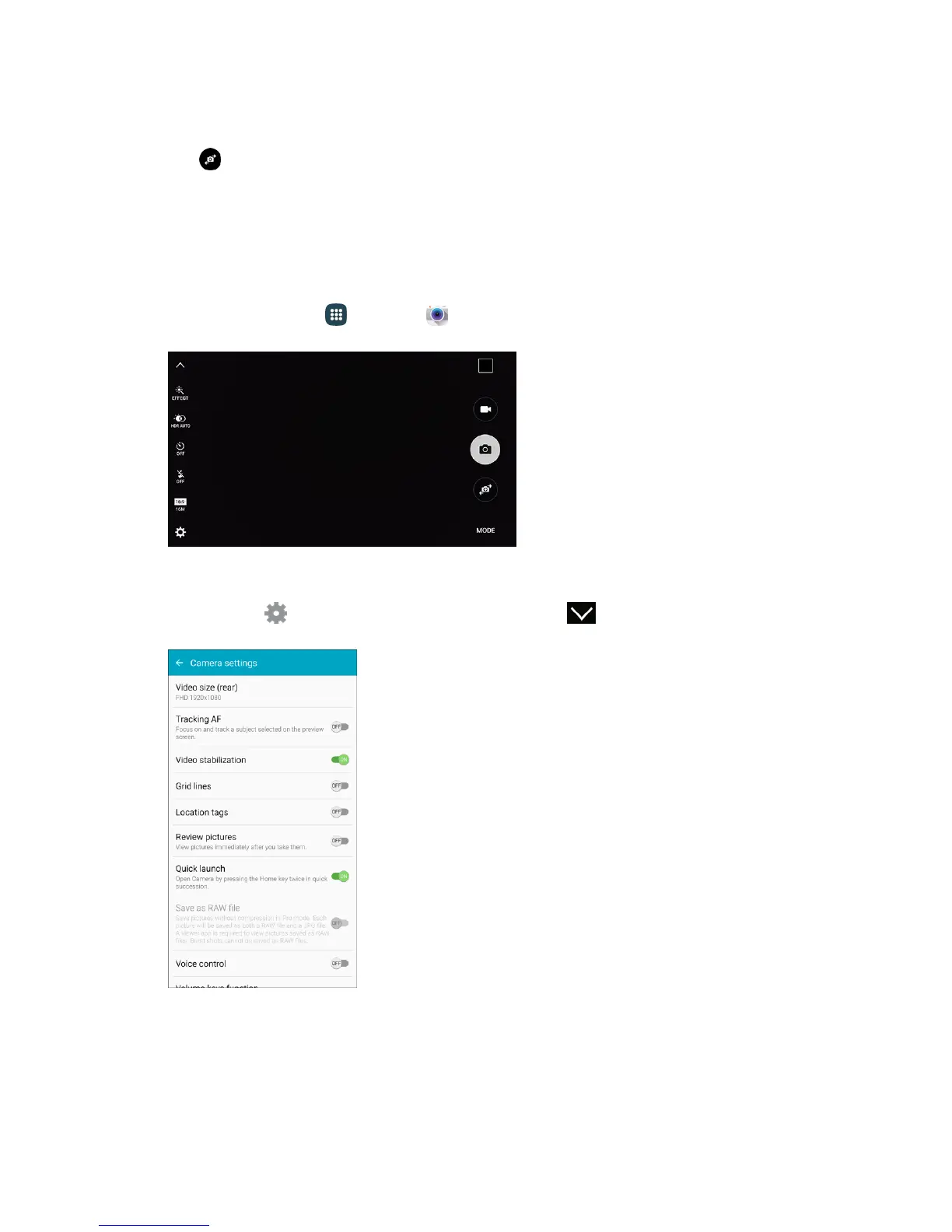 Note: Not all settings will be available at all times, depending on which camera is in use (front or rear).