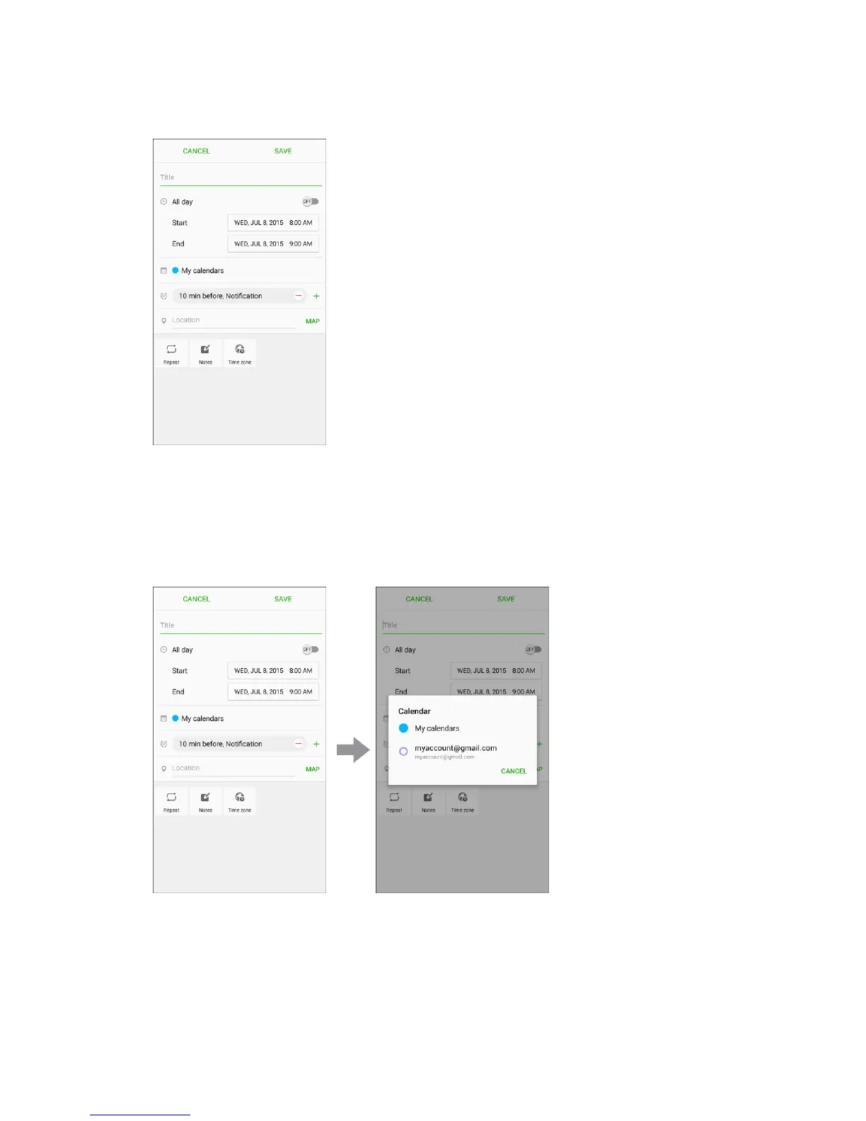 3. Enter an event title, start date/time, end date/time, etc., and then tap Save.