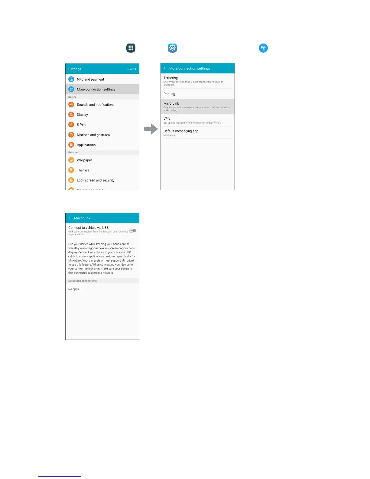 2. From home, tap Apps > Settings > More connection settings > MirrorLink.