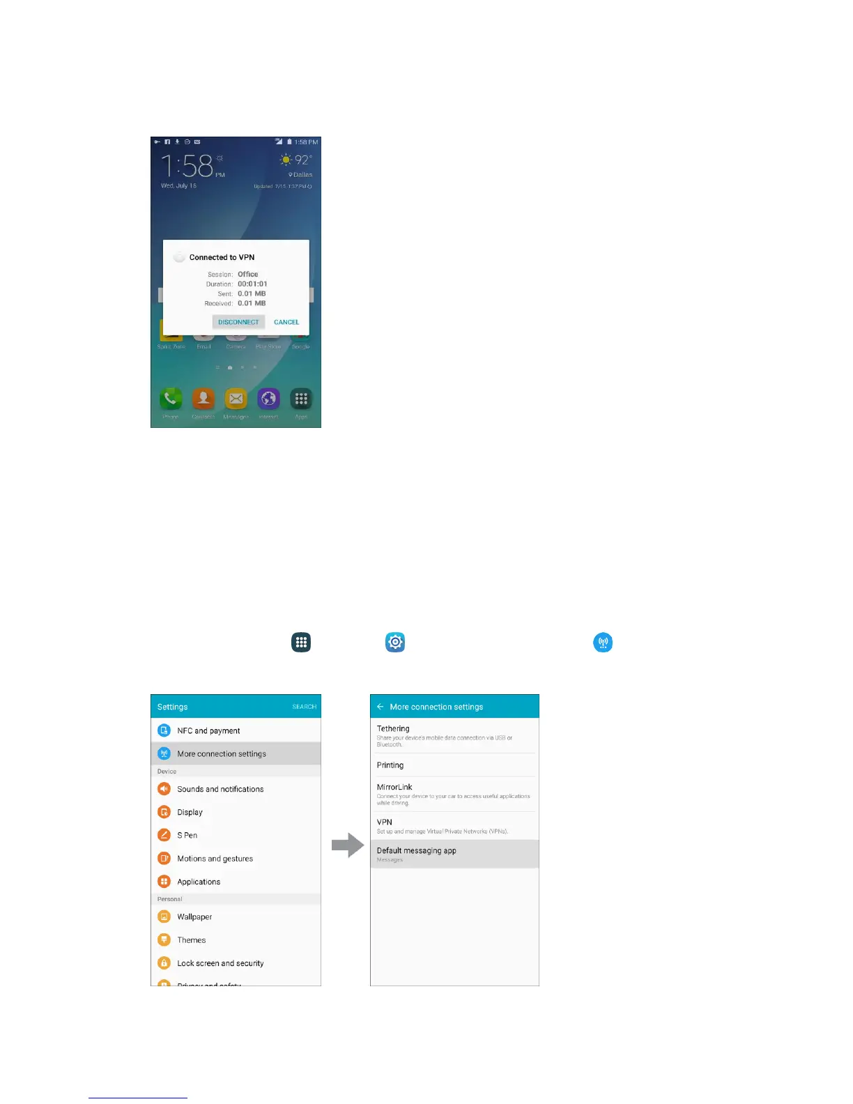 1. From home, tap Apps > Settings > More connection settings > Default messaging