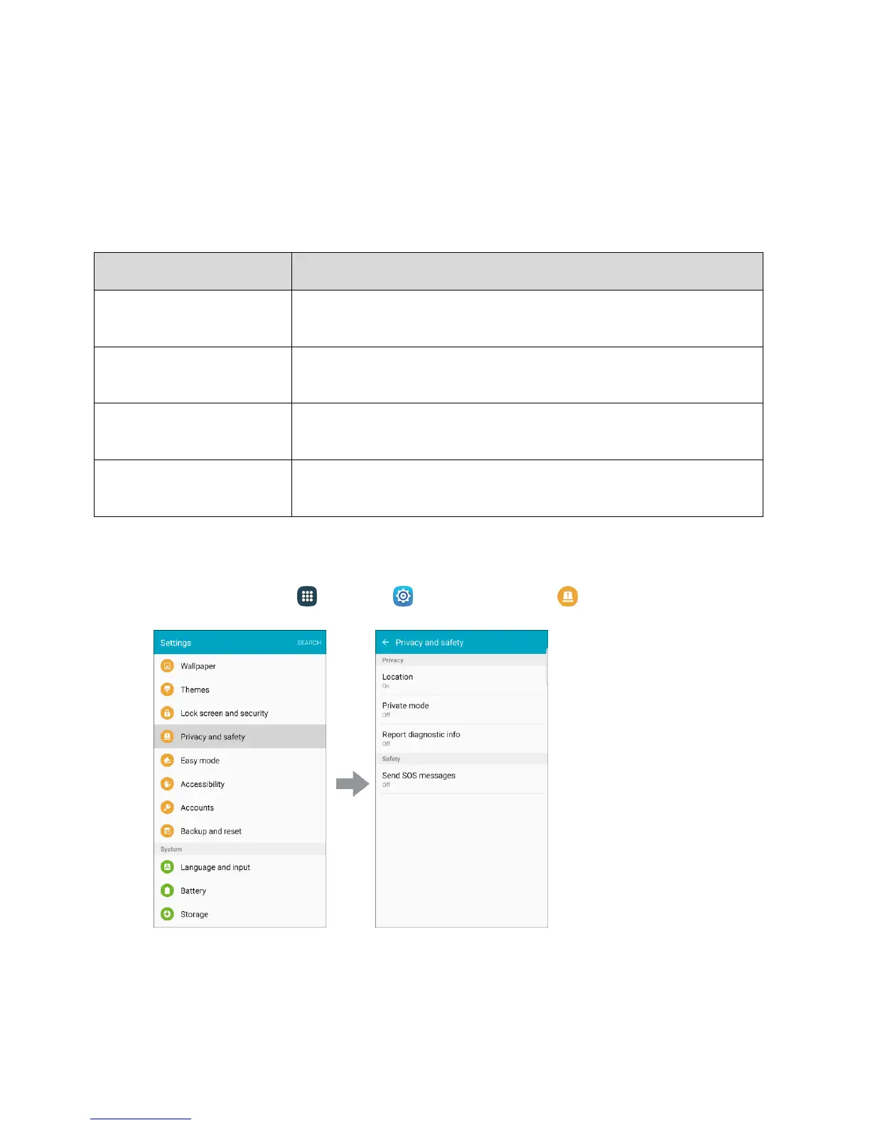 ■ From home, tap Apps > Settings > Privacy and safety .