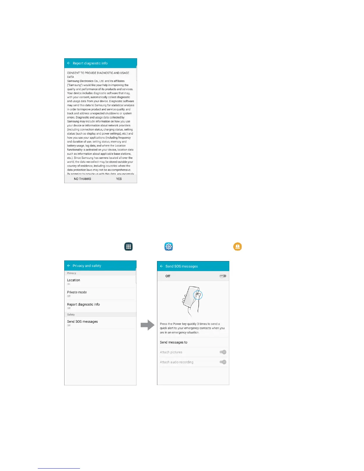 1. From home, tap Apps > Settings > Privacy and safety > Send SOS messages.