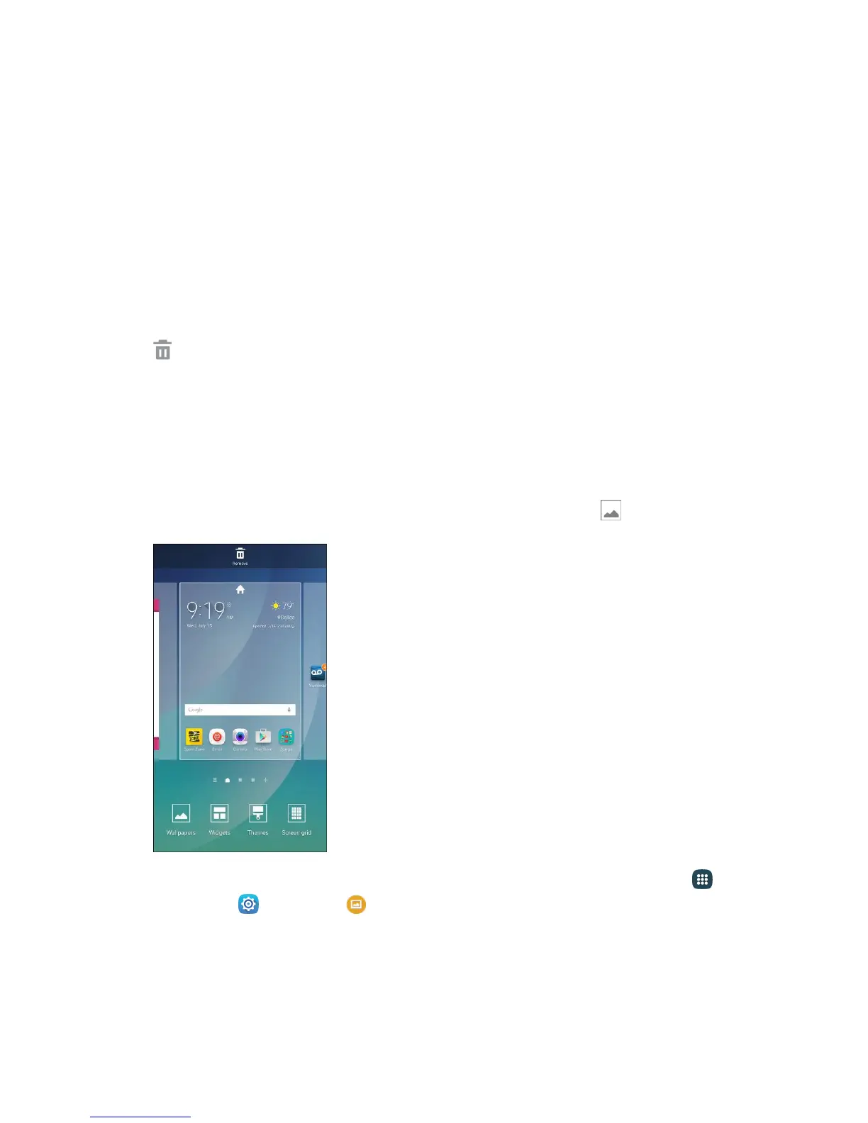 ● Deleting Widgets and Icons: From home, touch and hold an item and then drag it to Remove