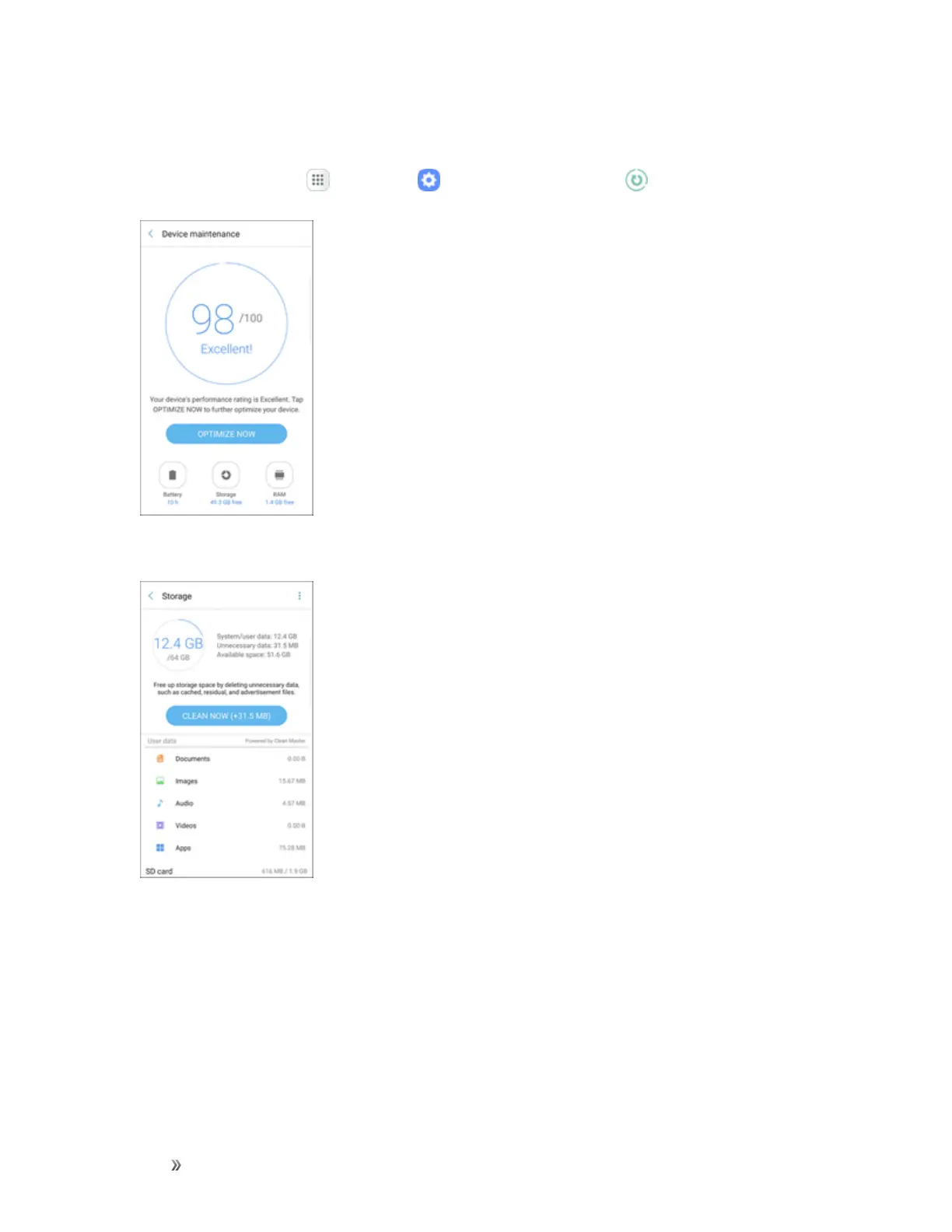 Fromhome,tapApps >Settings >Device maintenance .