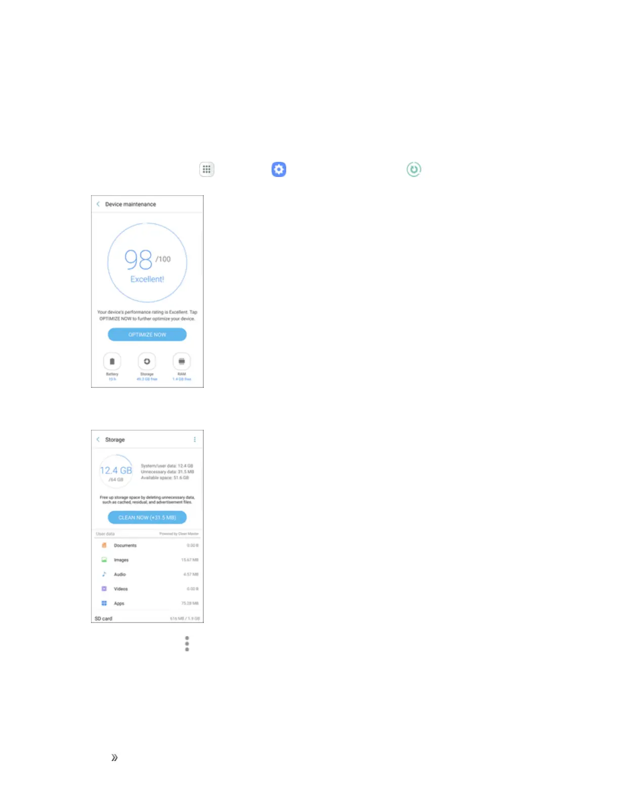 Fromhome,tapApps >Settings >Device maintenance .