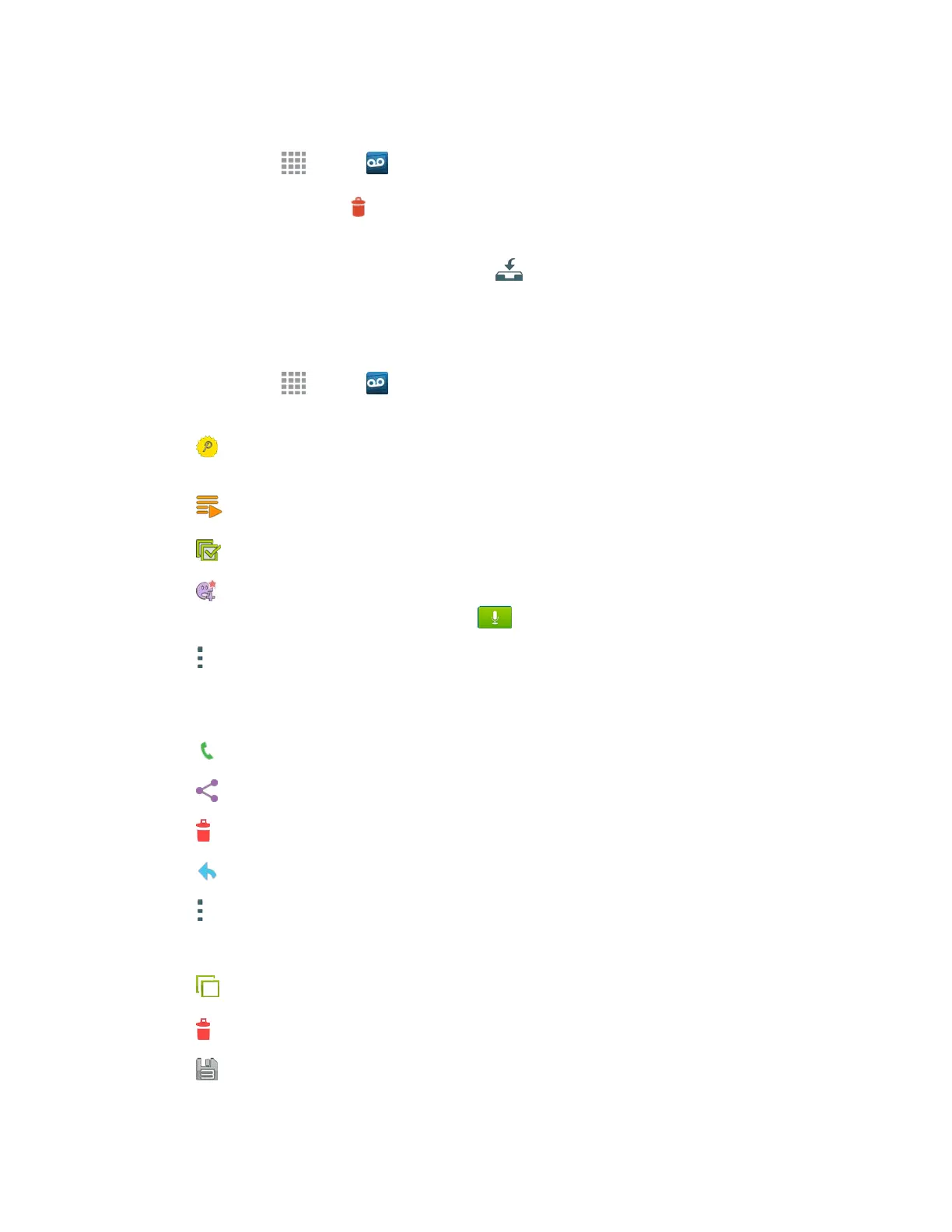 1. From home, tap Apps > Voicemail. The following options are available from the main