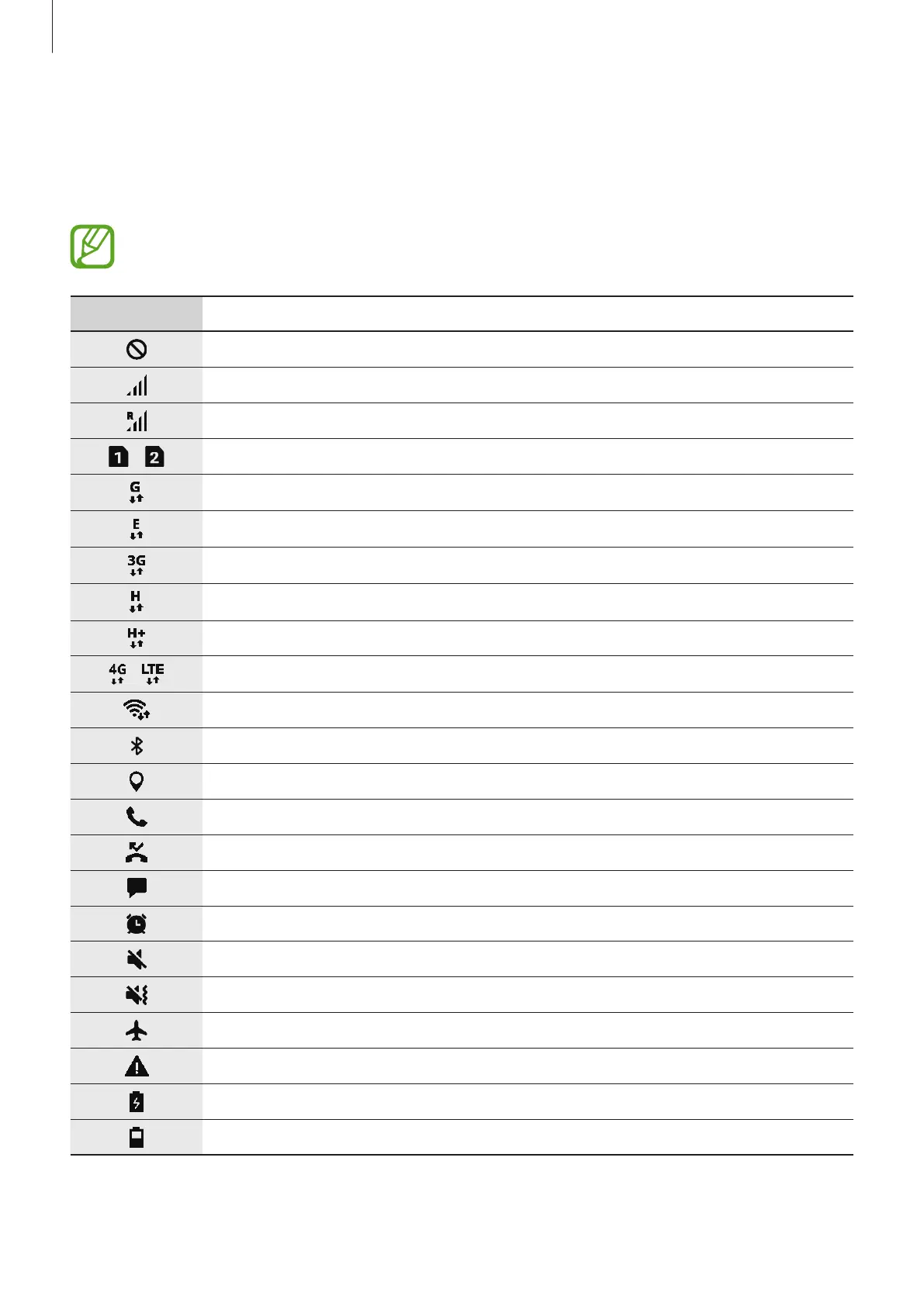 Indicator icons appear on the status bar at the top of the screen. The icons listed in the table