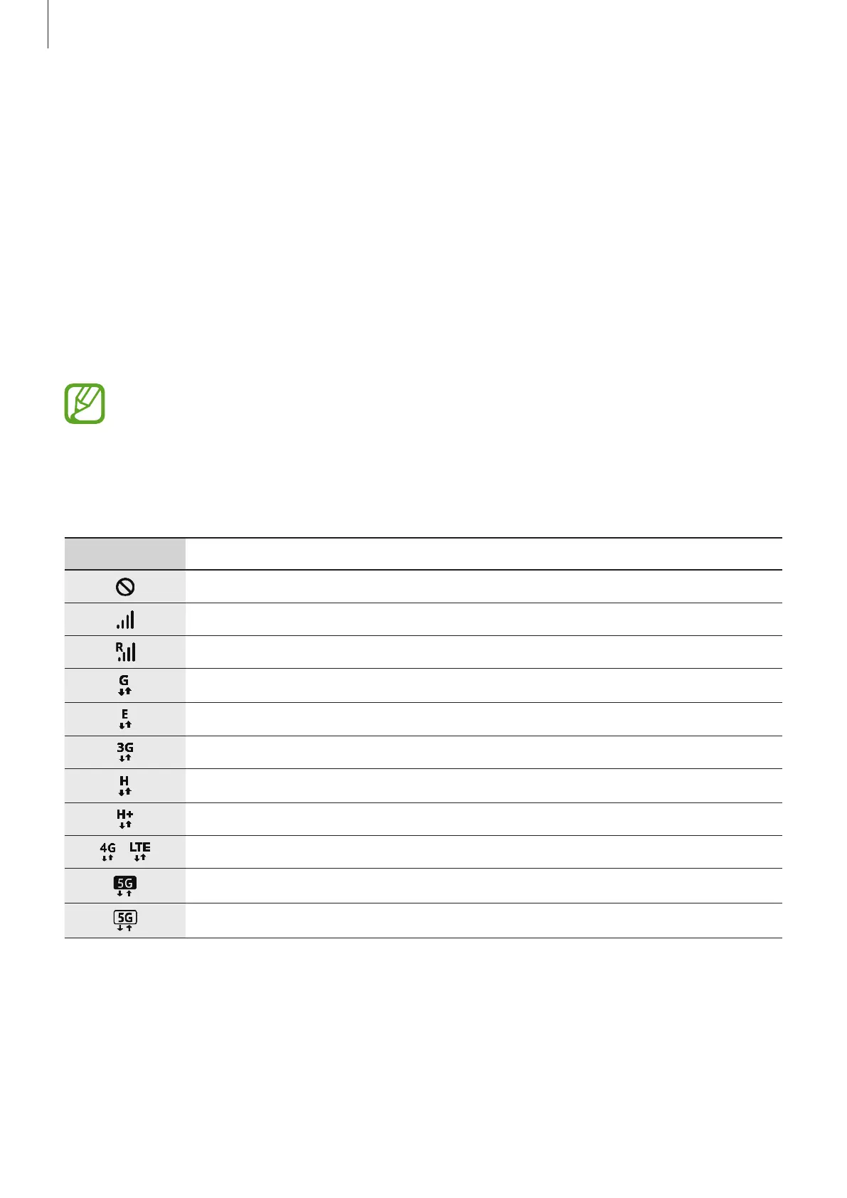 Indicator icons appear on the status bar at the top of the screen. The icons listed in the table