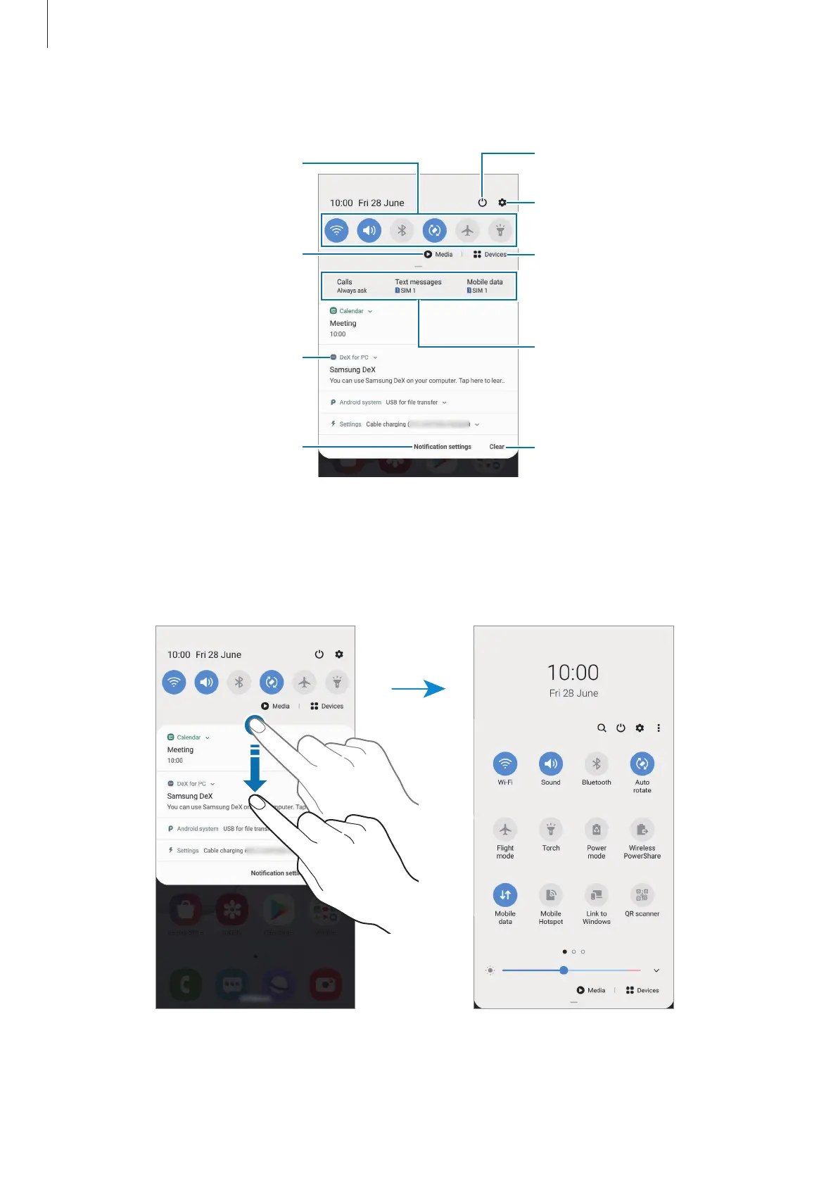 Tap quick setting buttons to activate certain features. Swipe downwards on the notification