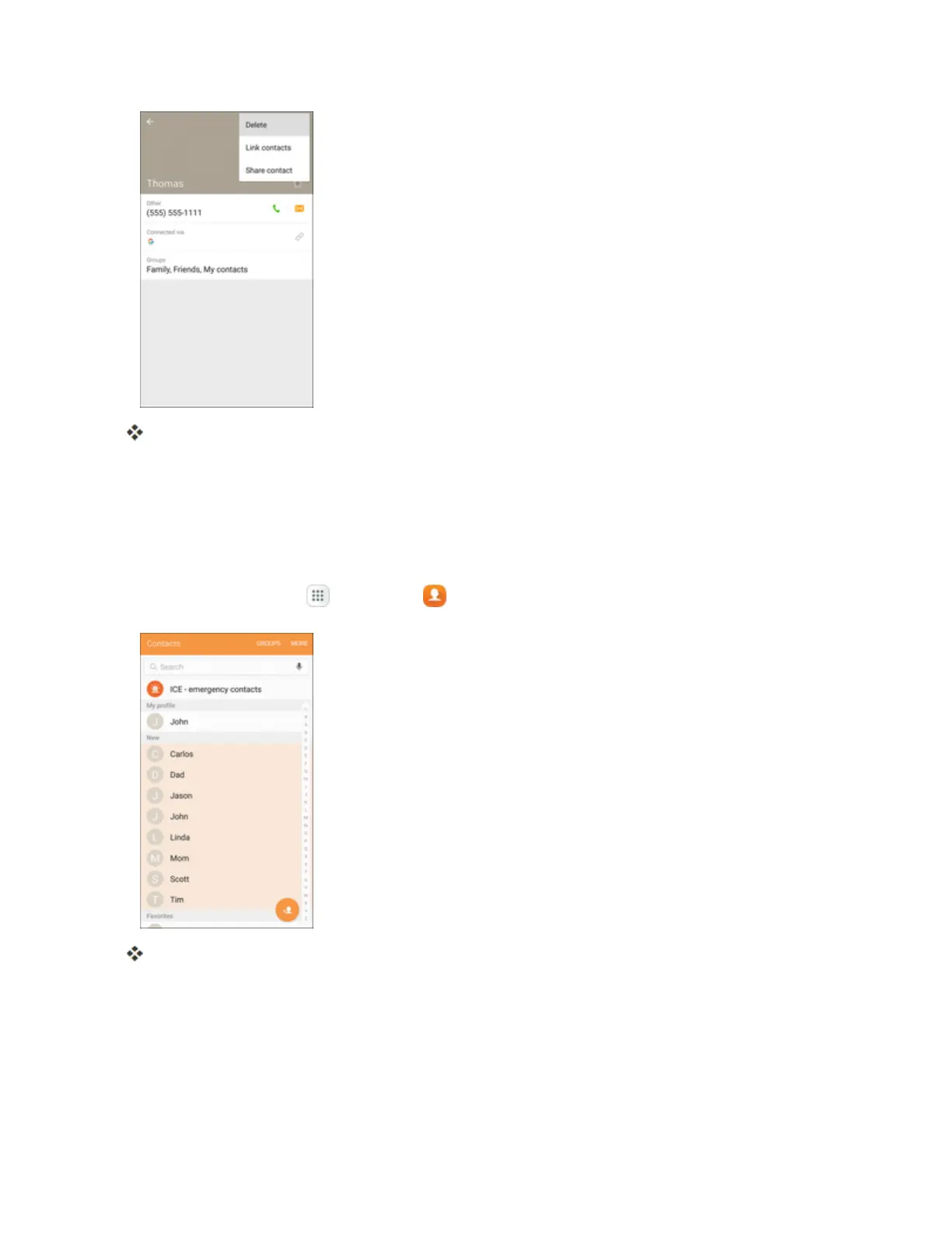 Tip:YoucanalsotouchandholdthecontactfromtheContactslistandtapDelete>Delete.