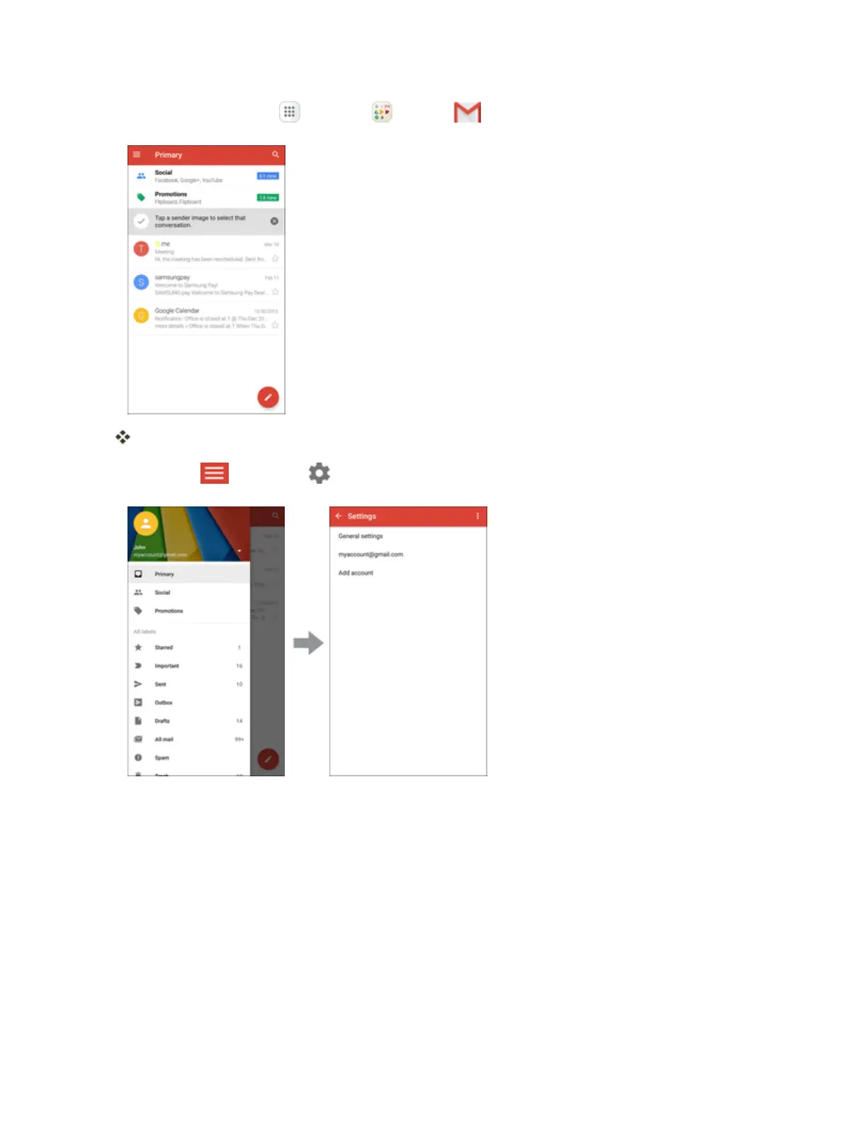 l General settings:Gmaildefaultaction,Conversationview,Swipeactions,Senderimage,
