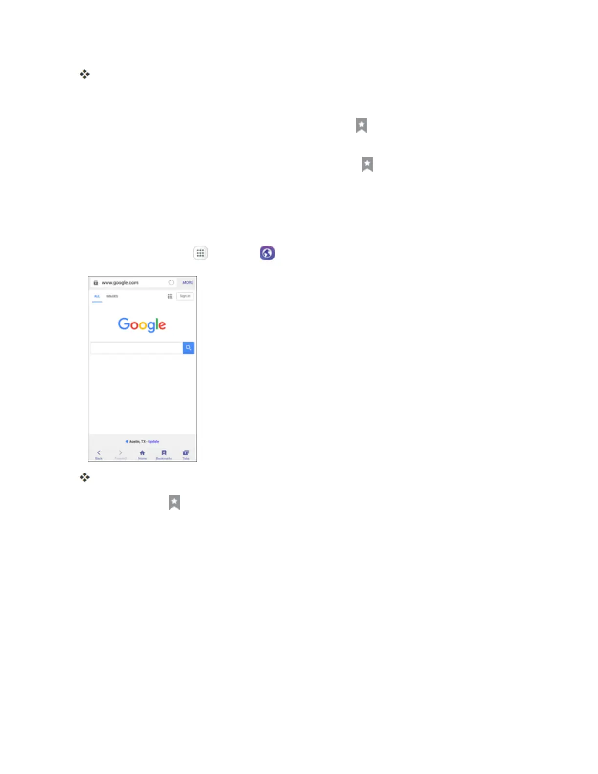 Deleting Bookmarks:Fromthebrowser,tapBookmarks ,touchandholdabookmark,and