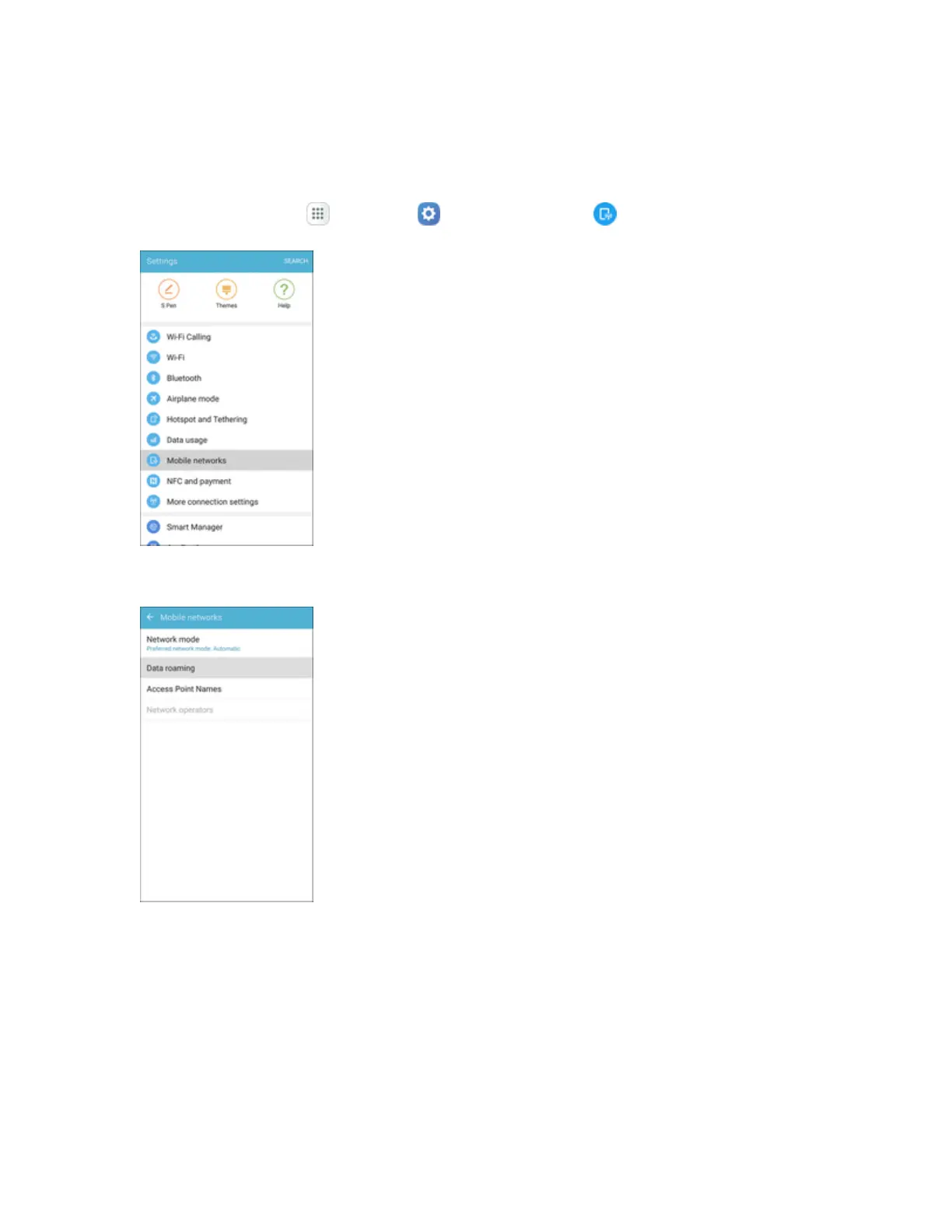 Fromhome,tapApps >Settings >Mobile networks .