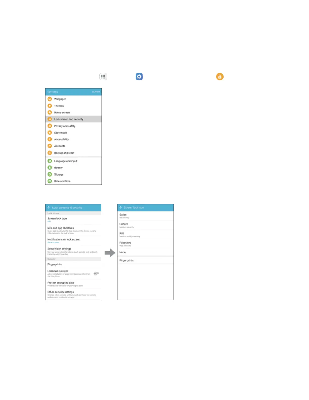 Fromhome,tapApps >Settings > Lock screen and security .