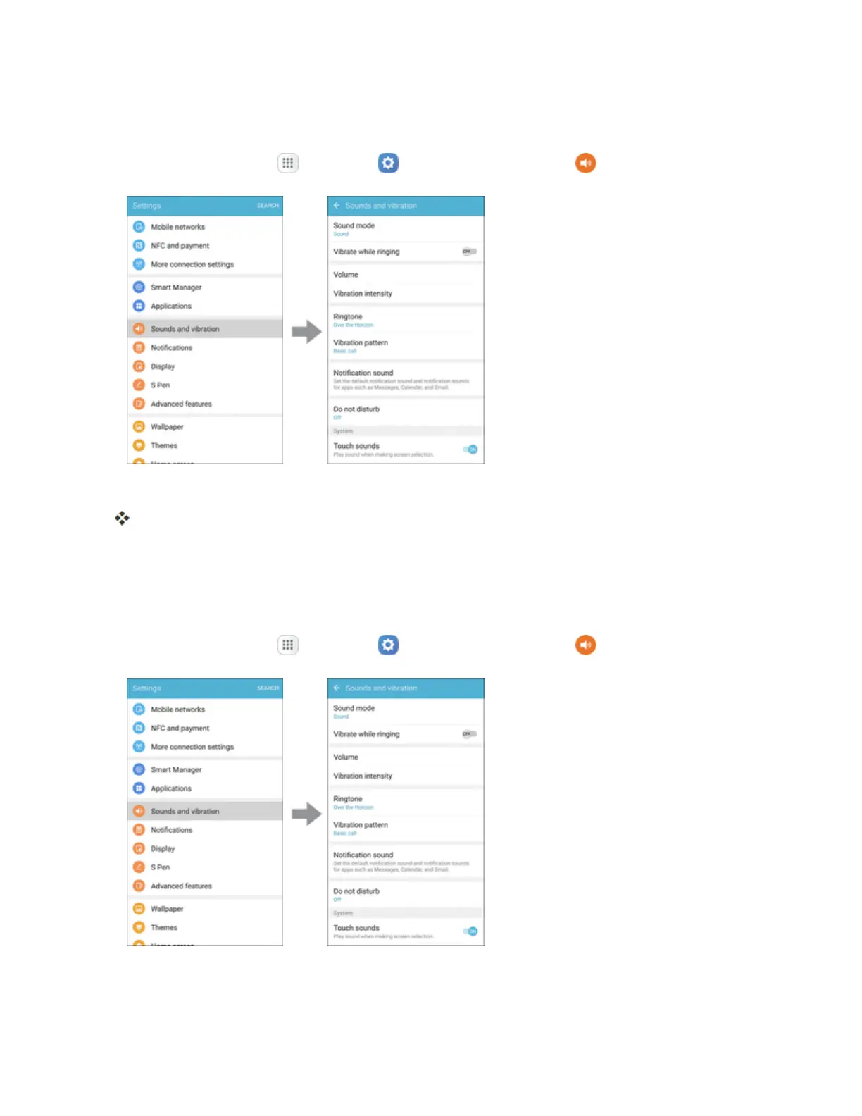 Fromhome,tapApps >Settings >Sounds and vibration .
