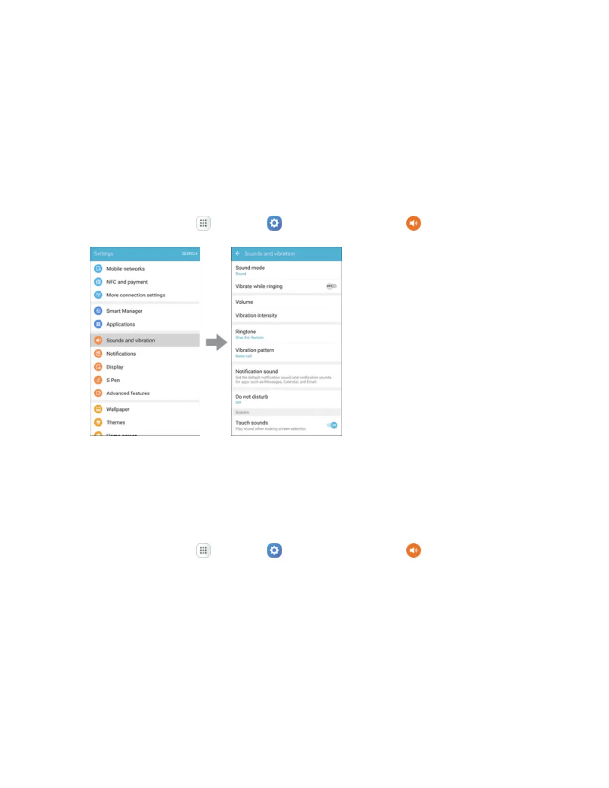 Fromhome,tapApps >Settings >Sounds and vibration .
