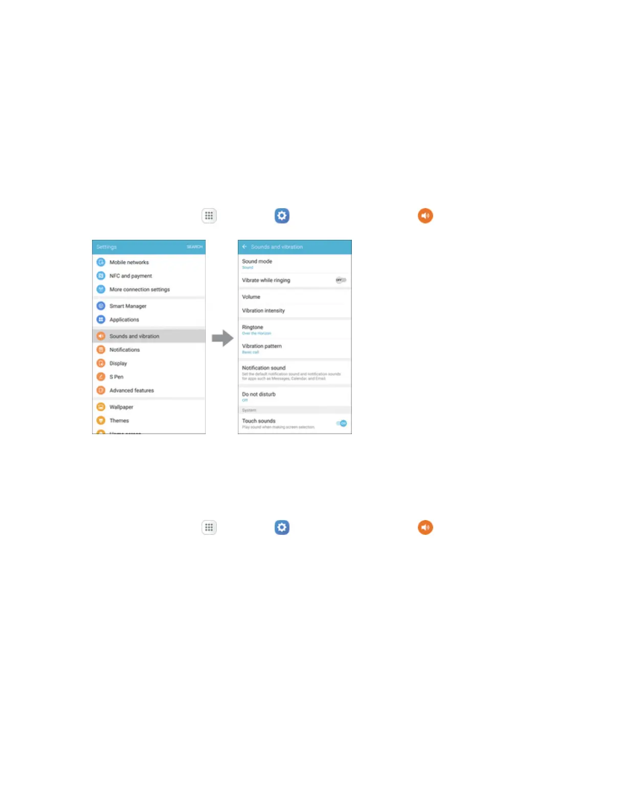 Fromhome,tapApps >Settings >Sounds and vibration .