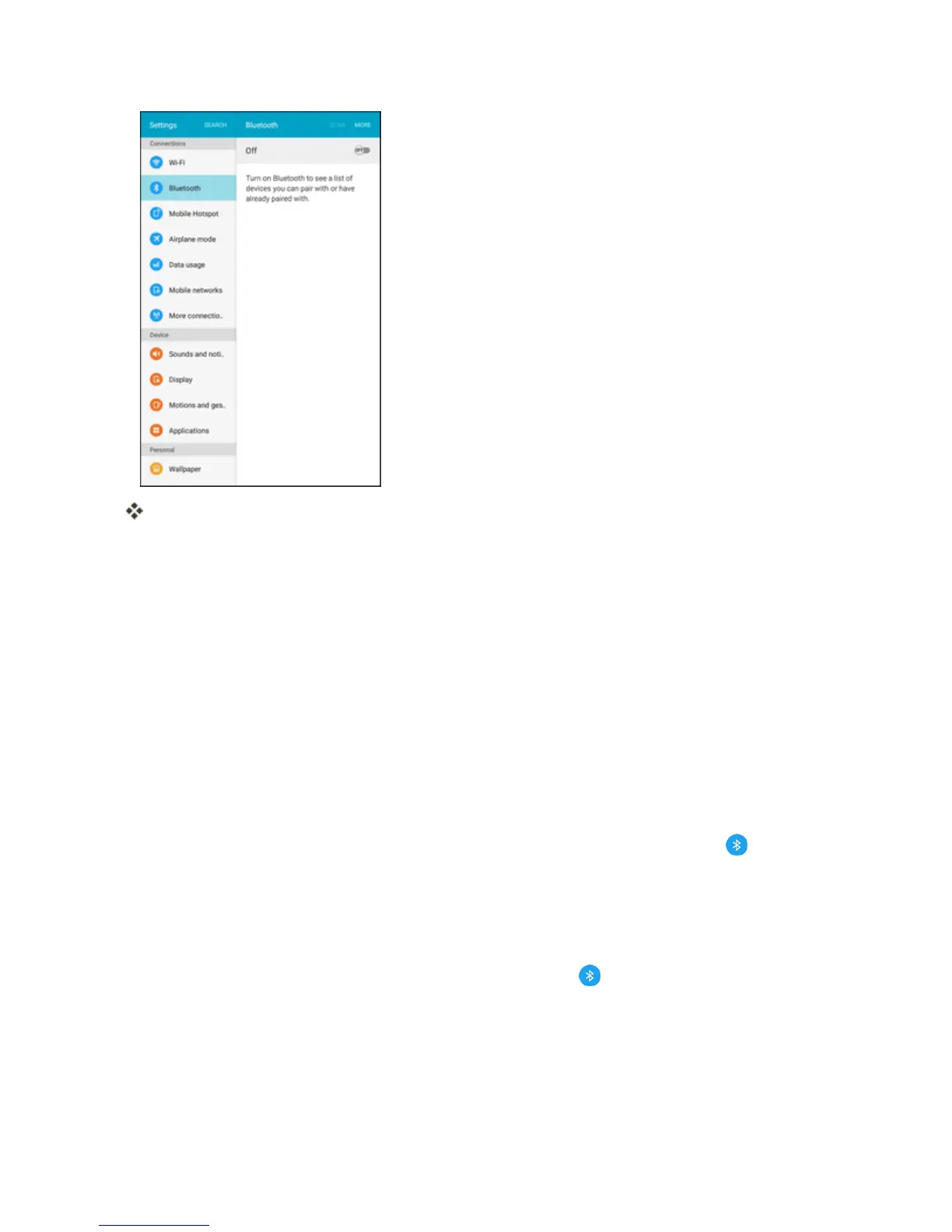 n Enable Bluetooth:InBluetoothsettings,tapON/OFFtoenable.