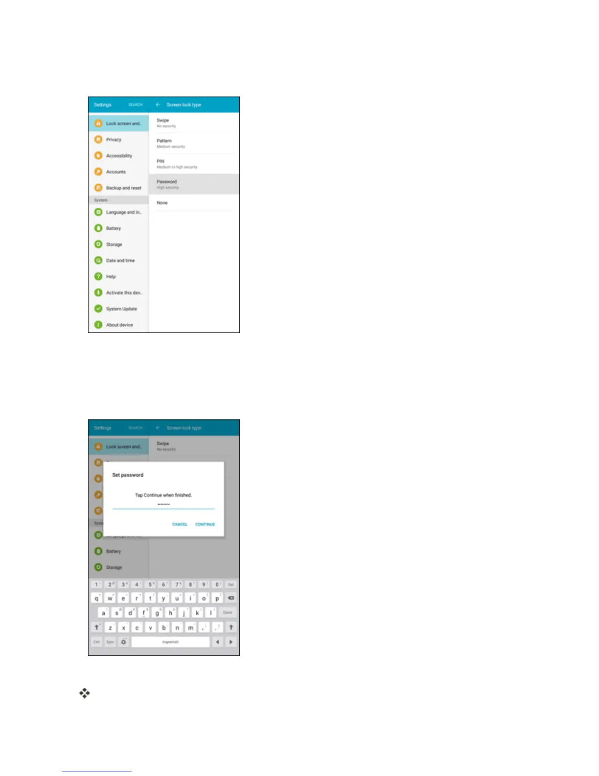 Note:Forcredentialstorage,youcanusePattern,PIN,orPasswordscreenlocktypes.SeeScreen