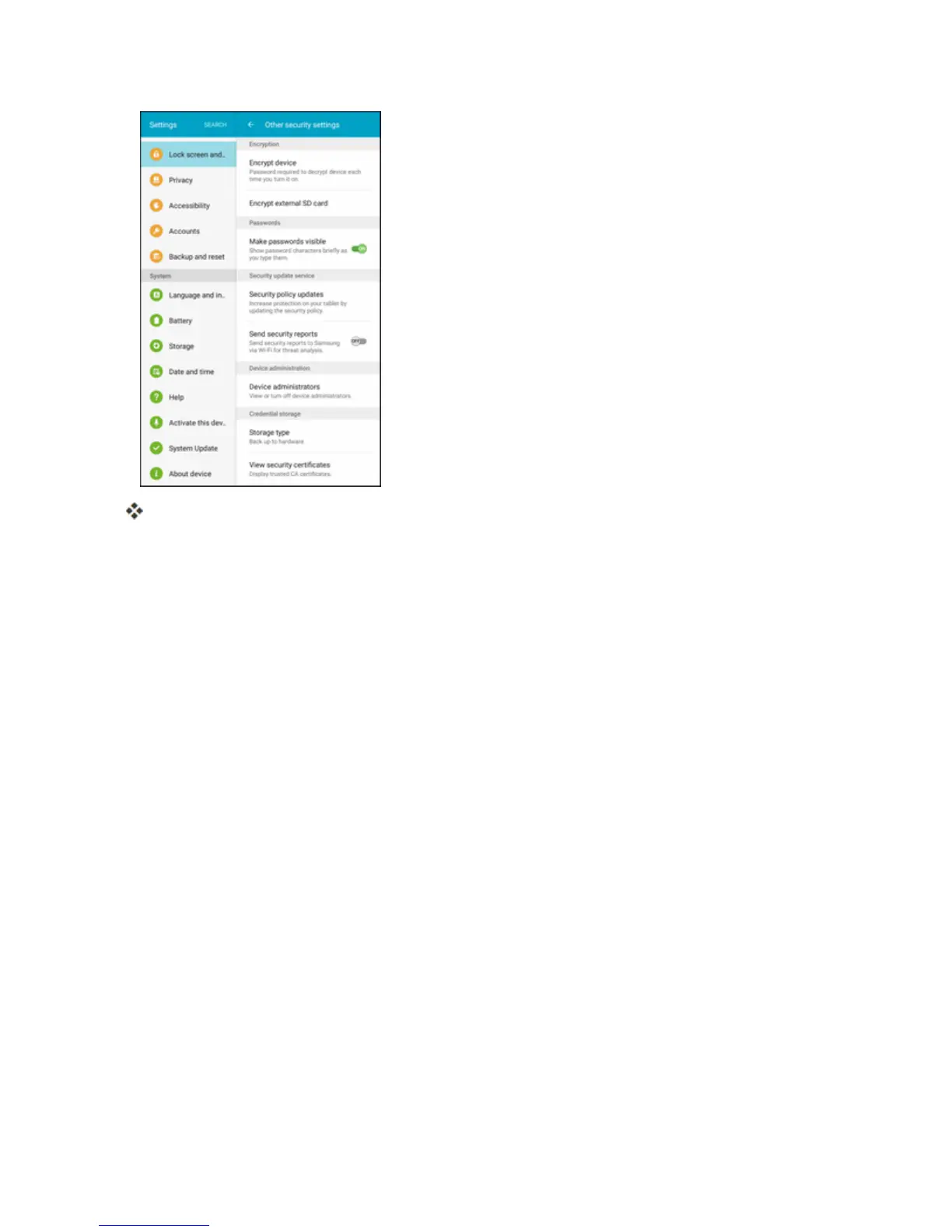 l View security certificates:Displaycertificatesinyourdevice’sROMandothercertificates