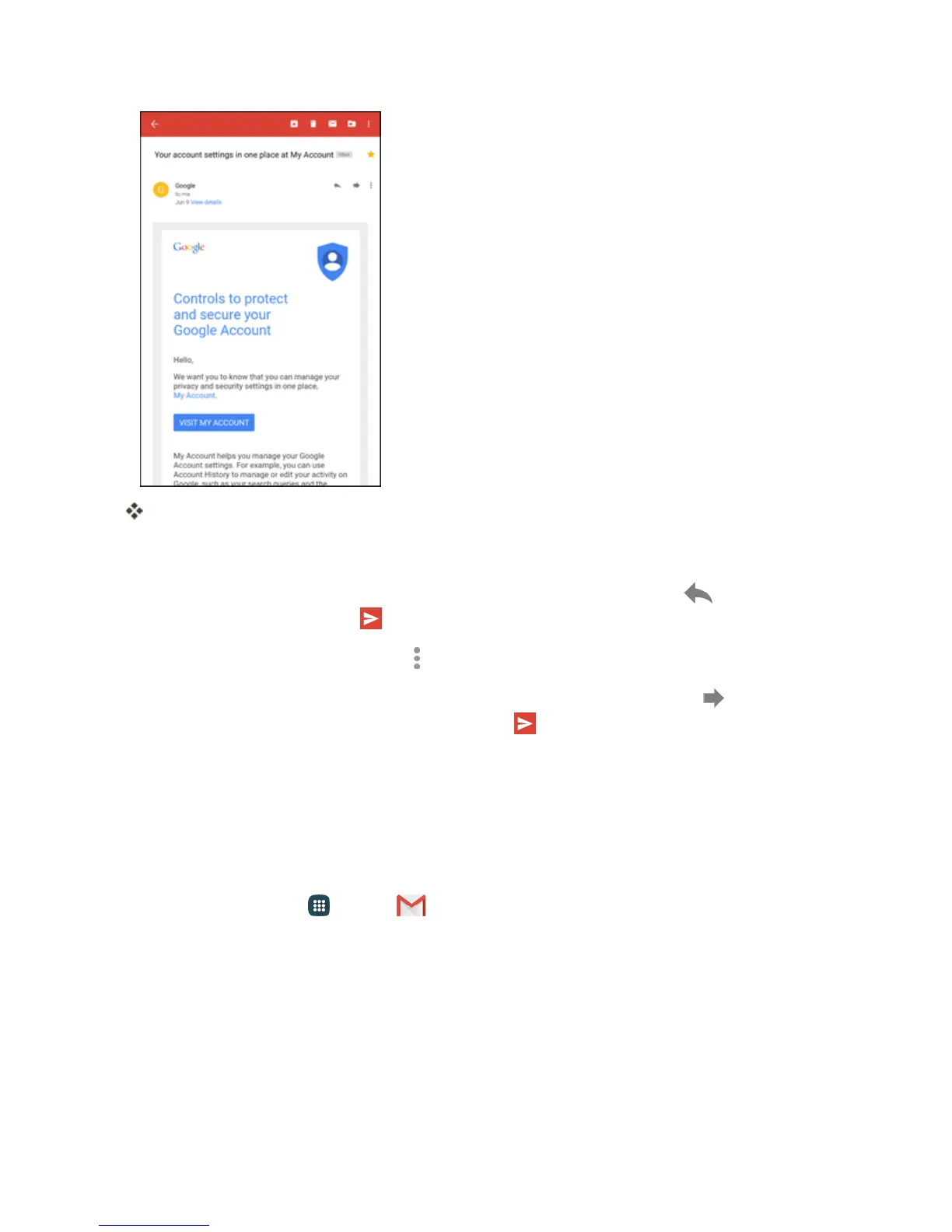 Forwarding Gmail Messages:WiththeGmailmessageopen,tapForward ,entera