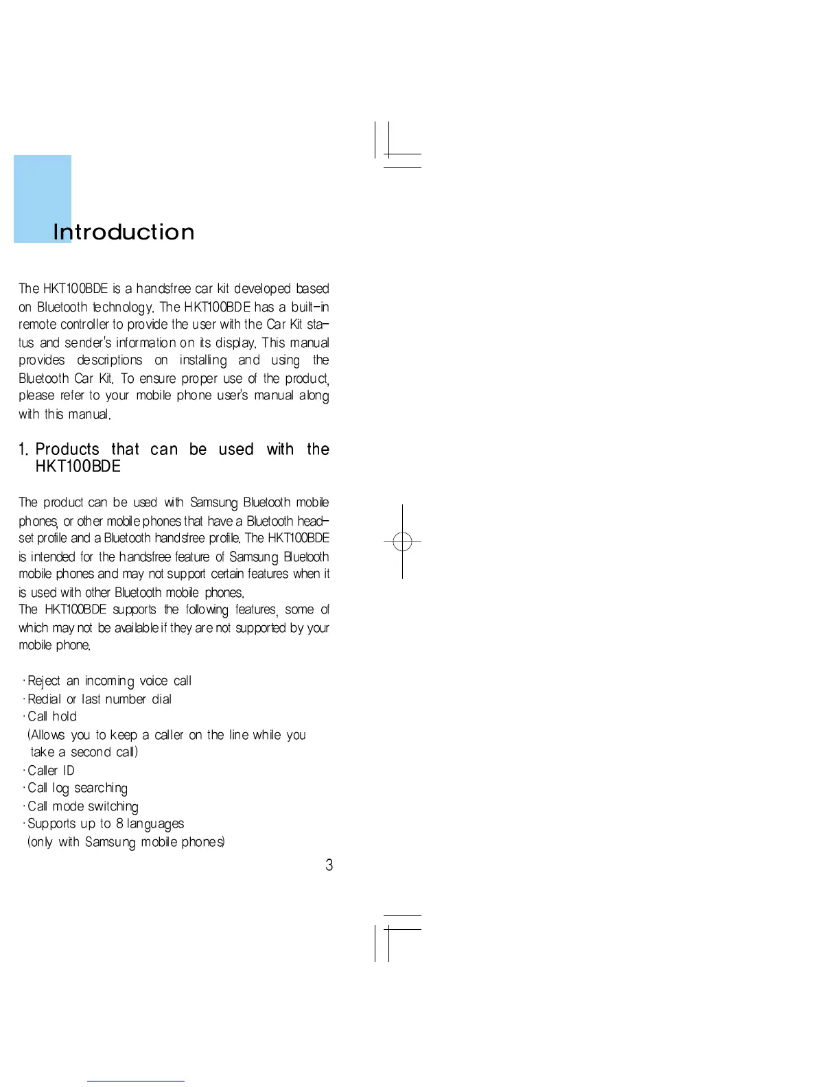 Samsung HKT100BDE - Introduction to Bluetooth Handsfree Car Kit; Compatible Products and Features