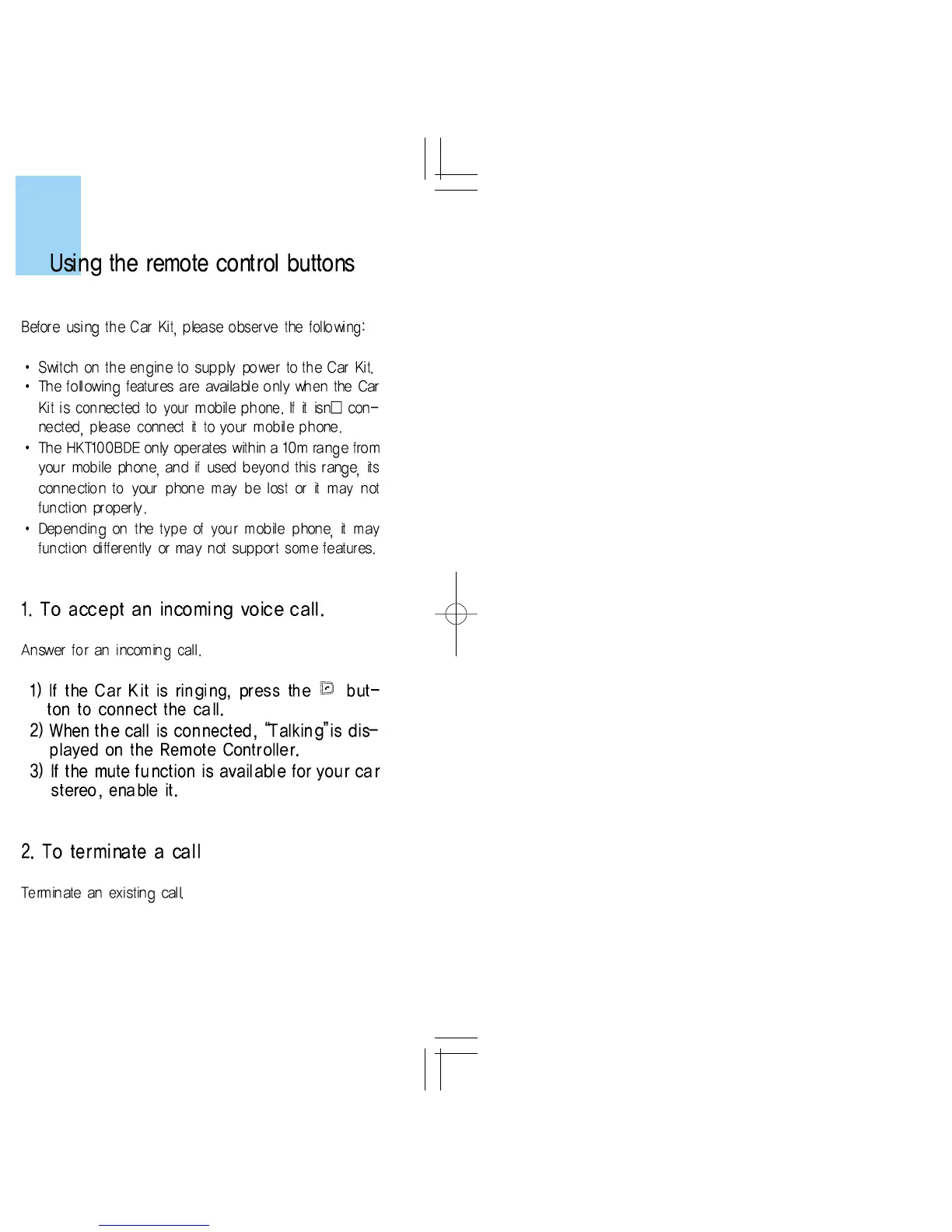 Samsung HKT100BDE - Using Remote Control Functions; Answering and Terminating Calls