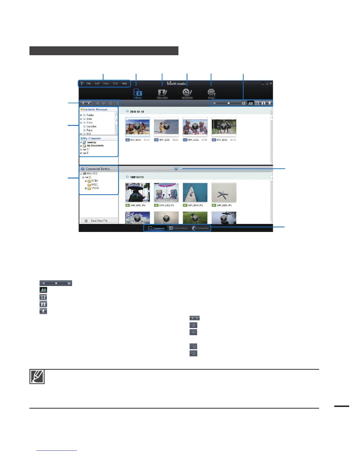 When the Intelli-studio starts up, thumbnails of videos and photos are displayed in the main window.