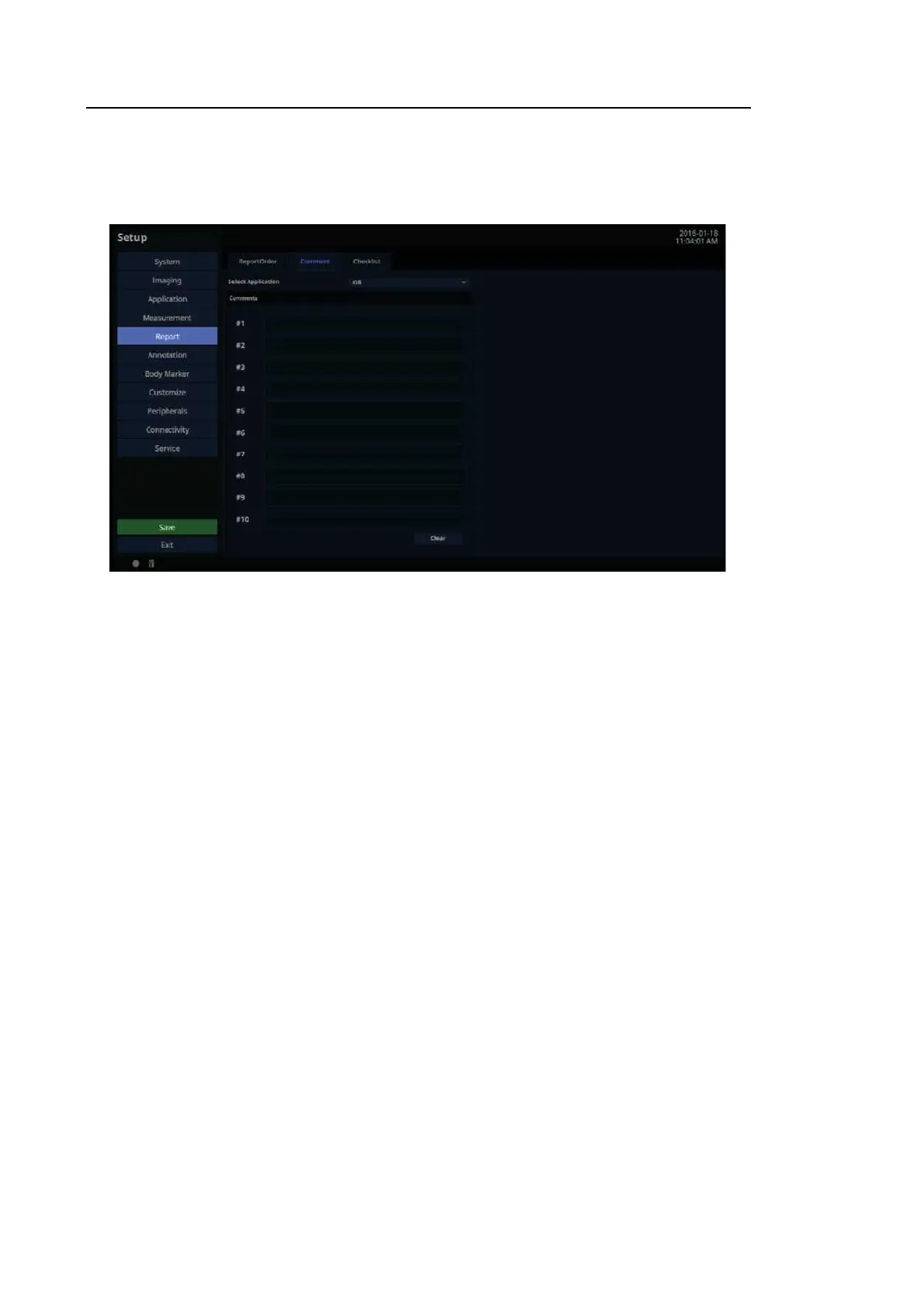 In the Setup screen, select the Comment tab in the Report category.