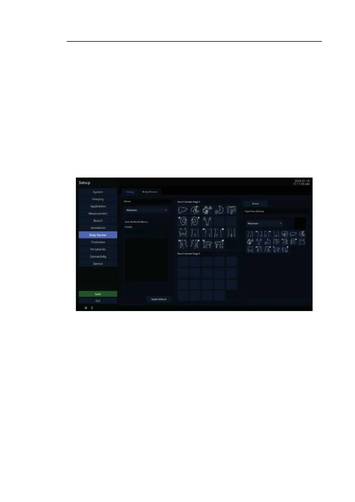 In the Setup screen, select the Body Marker tab. Or tap Body Marker on the touch screen.