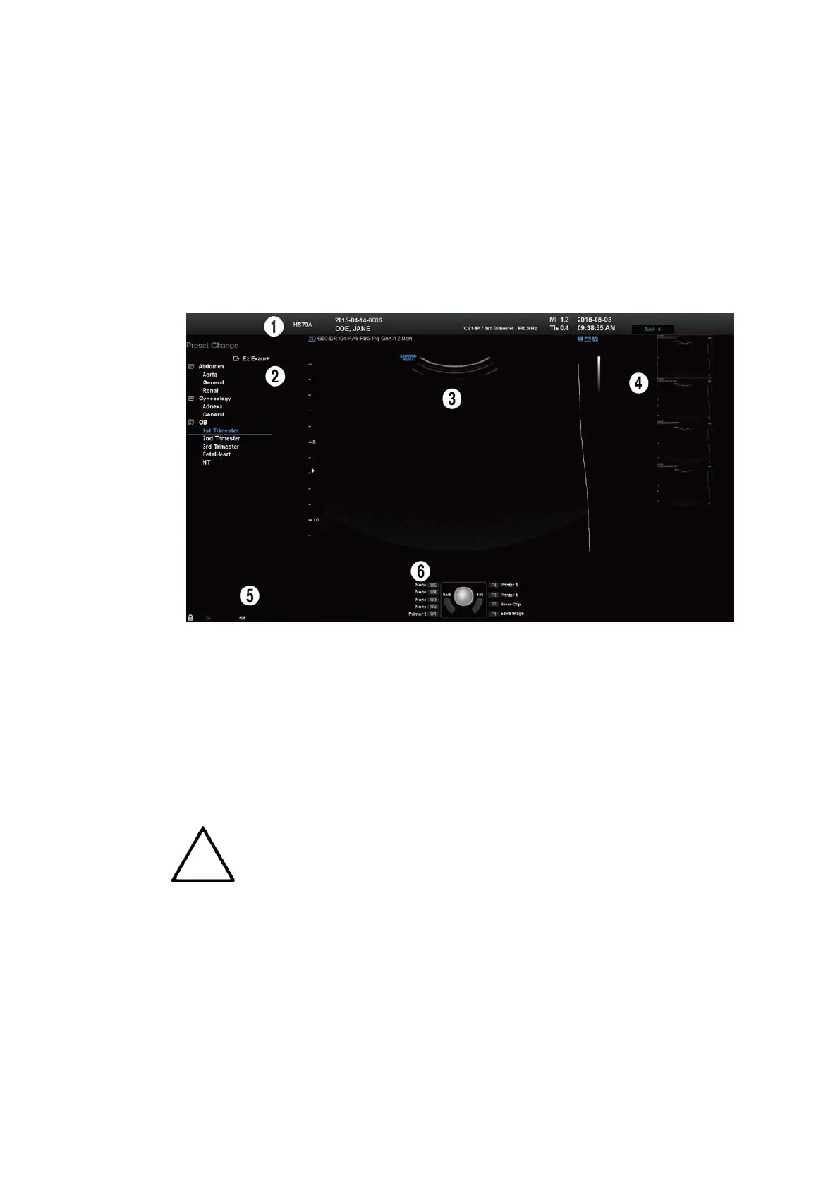 Displays patient name, hospital name, application, frame rate and depth, probe