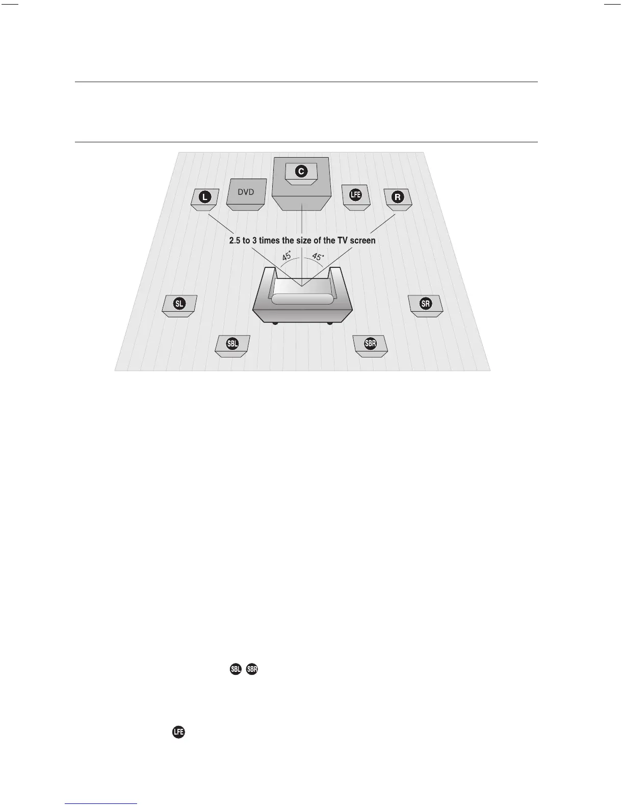 Place the surround back speakers about 70 cm to 1 m (2.3~3.3feet) above surround speakers, facing slightly