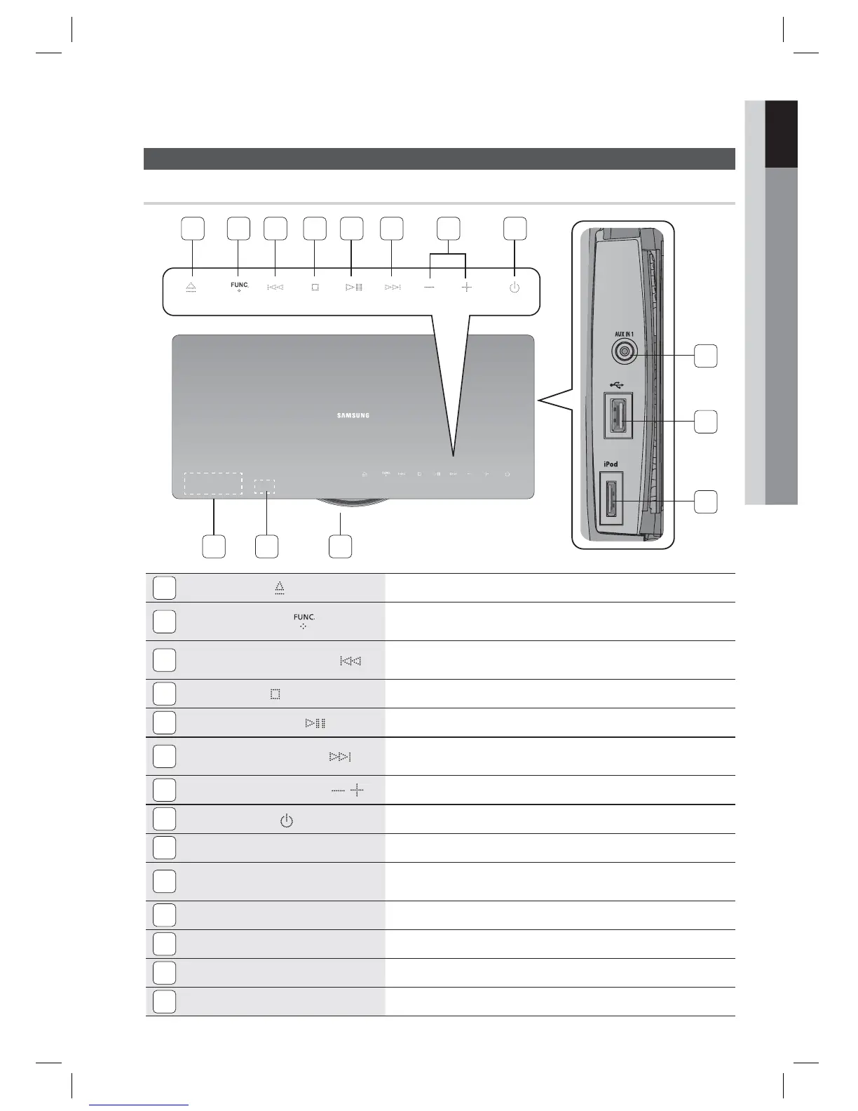 Connect here and play fi les from external USB storage devices such as MP3 players, USB