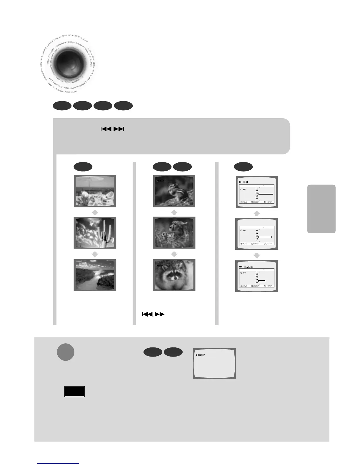 Each time the button is pressed briefly during playback, the previous or next chapter, track, or directory (file) will