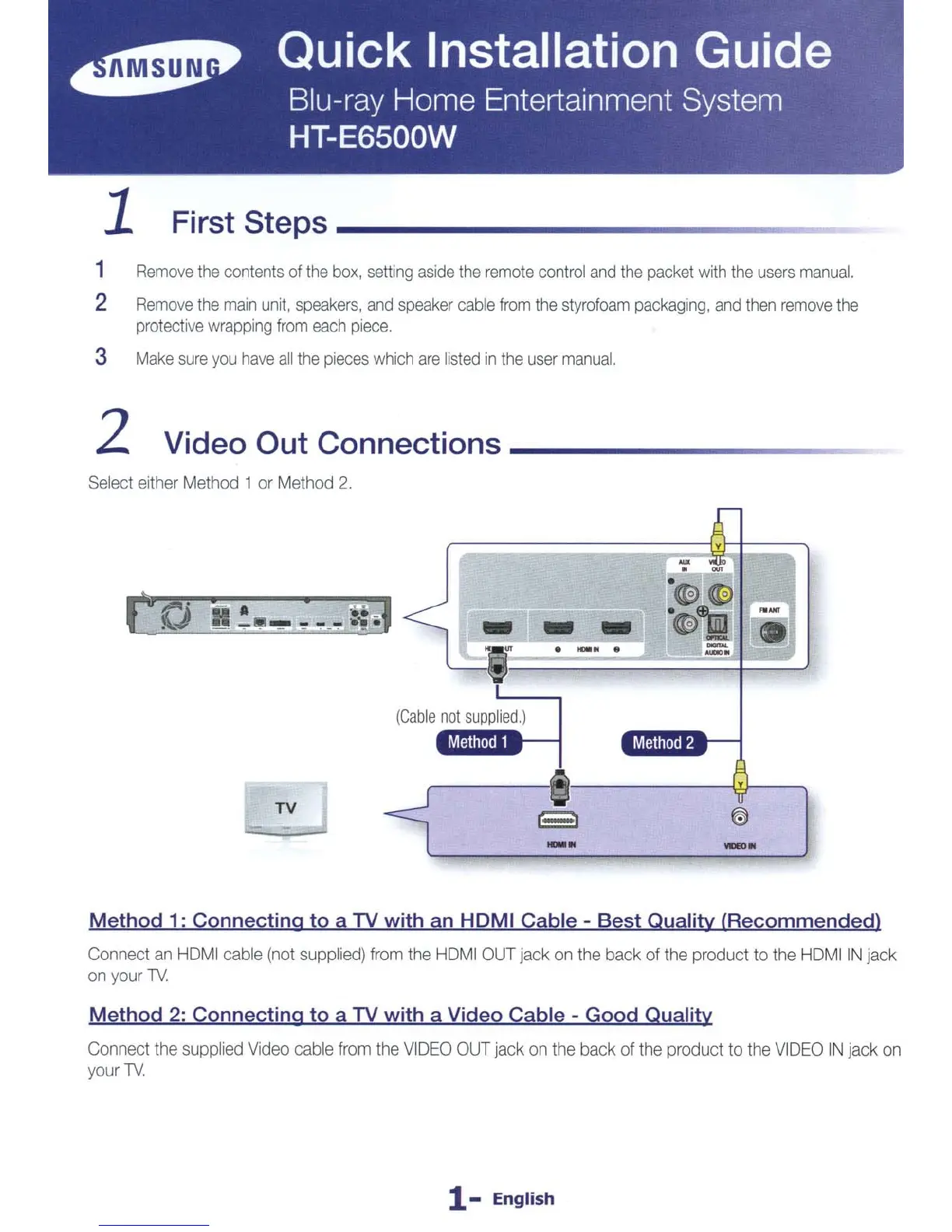 Samsung HT-E6500W - Quick Installation Guide; First Steps; Video Out Connections