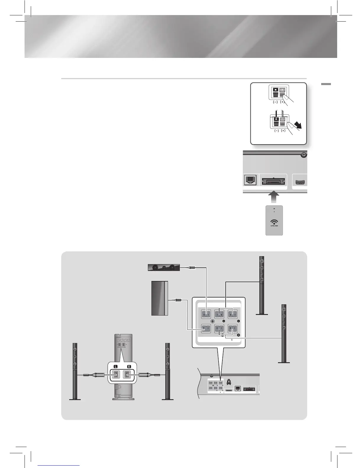 5. Connect the left and right surround speakers to the wireless receiver