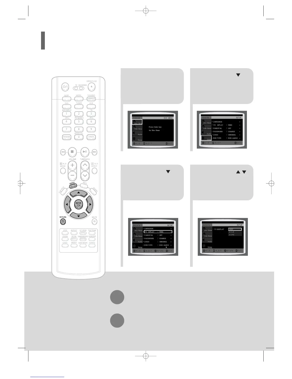 Depending on your TV type (Wide Screen or conventional 4:3), you can select the TV's aspect ratio.