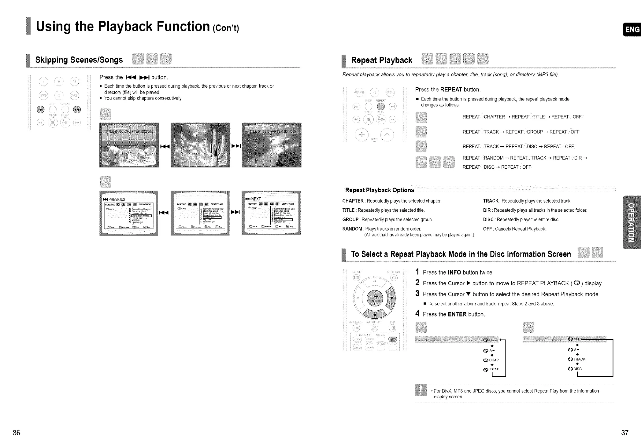 Repeat playback allows you to repeatedly play a chapter, title, track (song), or directory (MP3 file).