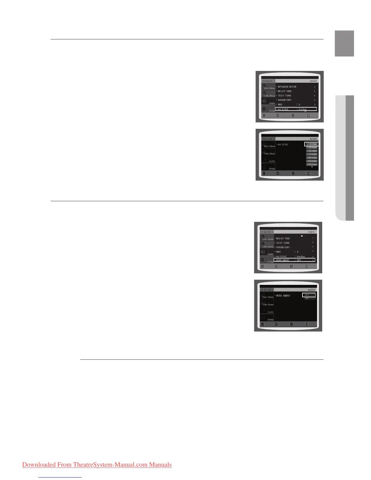You can set the audio delay time between 0 ms and 300 ms. Set