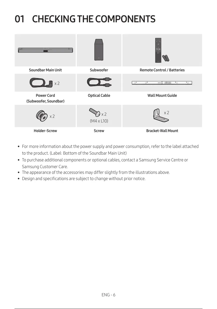 • To purchase additional components or optional cables, contact a Samsung Service Centre or