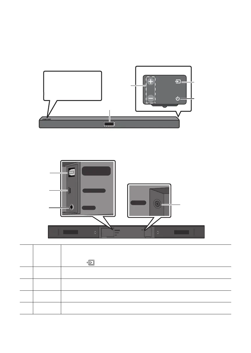 USB Connect a USB device here to play music les on the USB device through the Soundbar.