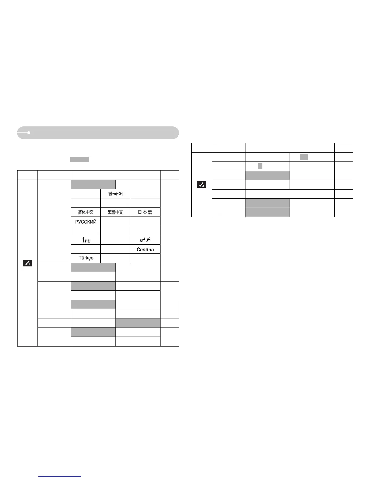 The items indicated by are default settings.